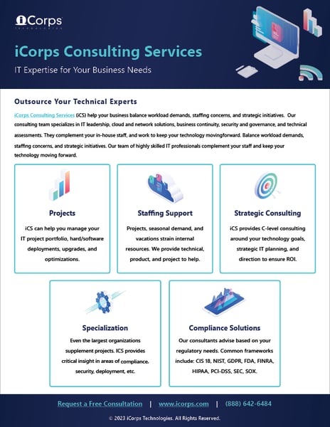 iCorps Consulting Services helps you balance your IT resources with the challenging workload demands imposed by a changing marketplace. Our team of highly skilled IT professionals extends your own staff to keep your technology moving forward.